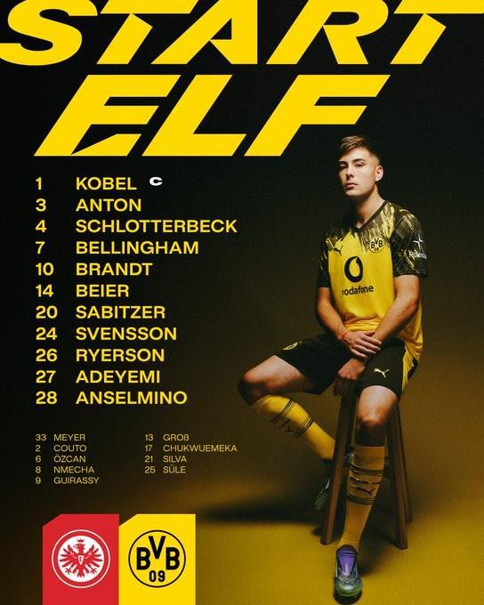 多特首发:1-科贝尔、3-安东、4-施洛特贝克、7-乔布-贝林厄姆、10-布兰特、14-拜尔、20-萨比策、24-丹尼尔-斯文松、26-瑞尔森、27-阿德耶米、28-安塞尔米诺